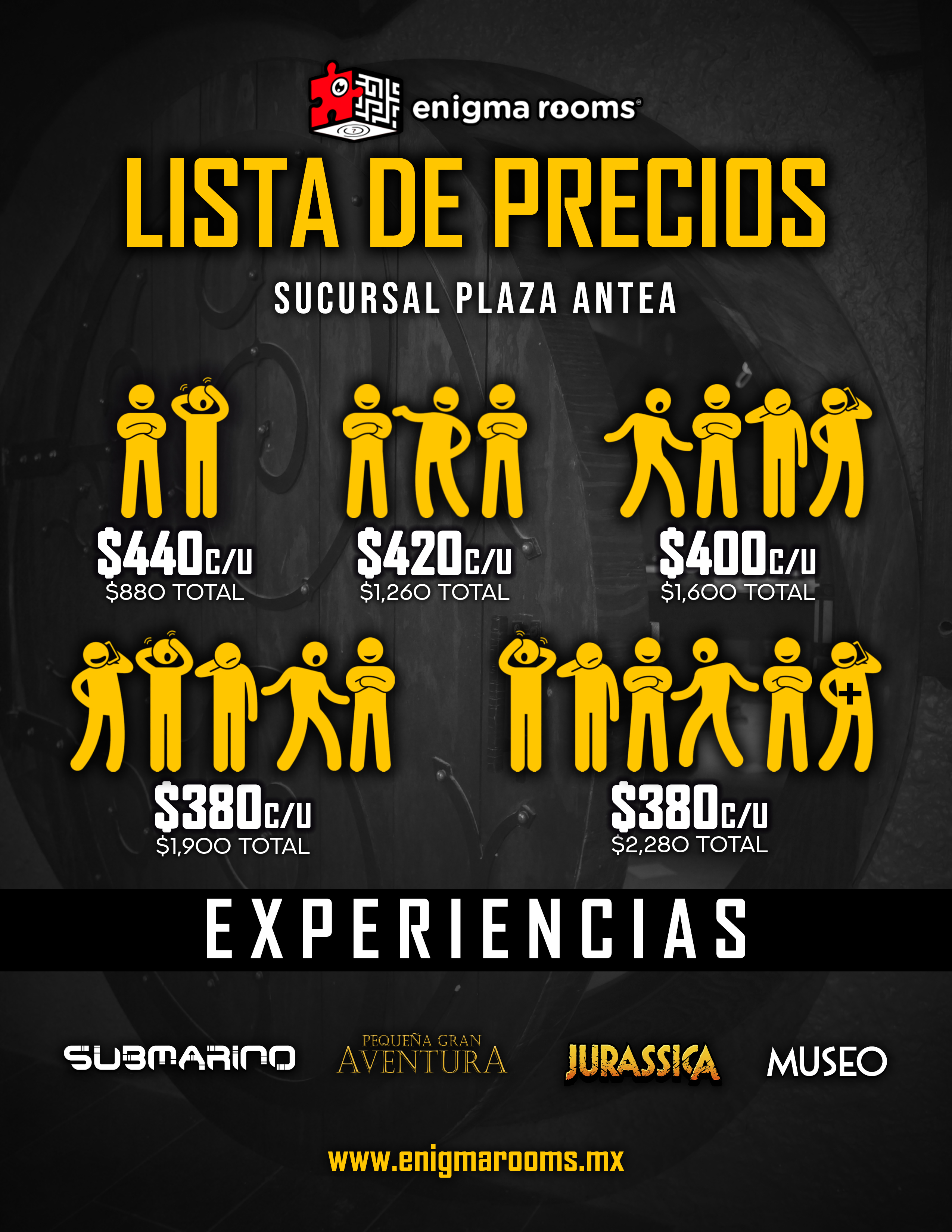 Los precios señalados son en MXN e incluyen 60 minutos máximo de juego en el Enigma Room® de tu elección. Todos los precios son más IVA, en caso de requerir factura. La factura se debe solicitar el día del evento, siendo únicamente facturable en el mes en el que se genera el ticket de venta.